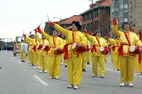 【明慧网二零零八年三月二十三日】二零零八年三月十七日,美国中部法轮功学员参加了俄亥俄州克利夫兰市举办的圣派翠克日(St. Patrick's Day)大游行。法轮功学员组成的腰鼓队方阵以声声法鼓向热情的观众展示着中华传统文化,传送着大法的福音。