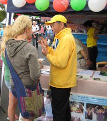 阴差阳错,活动前几天才发现,主办单位事前没有收到法轮功学员们的申请表,只能把学员们安排在“路旁”,而不是公园内。当天,学员们很快发现,所谓的“路旁”其实是进入公园主场的必经之地,而较大的空间使学员们可以方便的表演功法与发传单,来来往往的人潮络绎不绝。