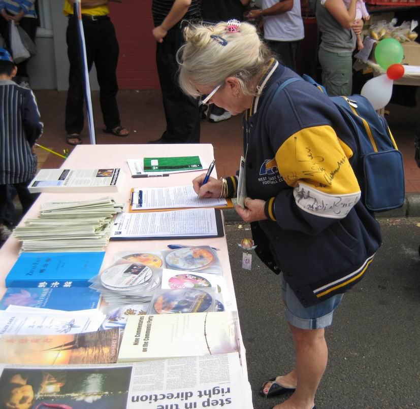 许多当地居民表示,他们已经知道法轮功在中国无辜被迫害的真相了。其中一位学生还说在学校社会学(Social Study)课堂的老师给他们看了揭露中共活摘器官的光碟,所以他要来签名,呼吁制止中共对法轮功学员的迫害。