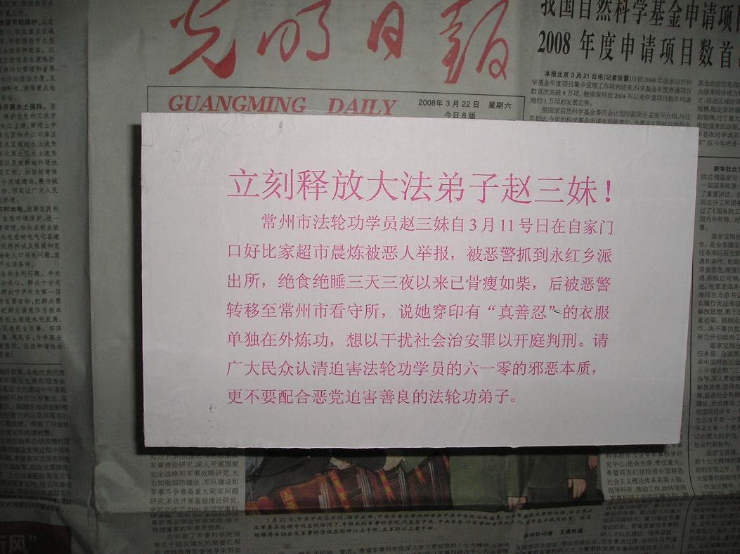 当地法轮功学员针对此一绑架事件,展开营救活动,曝光迫害真相。上图为法轮功学员在常州市公园、报刊栏、派出所附近张贴揭露迫害事件的真相传单。