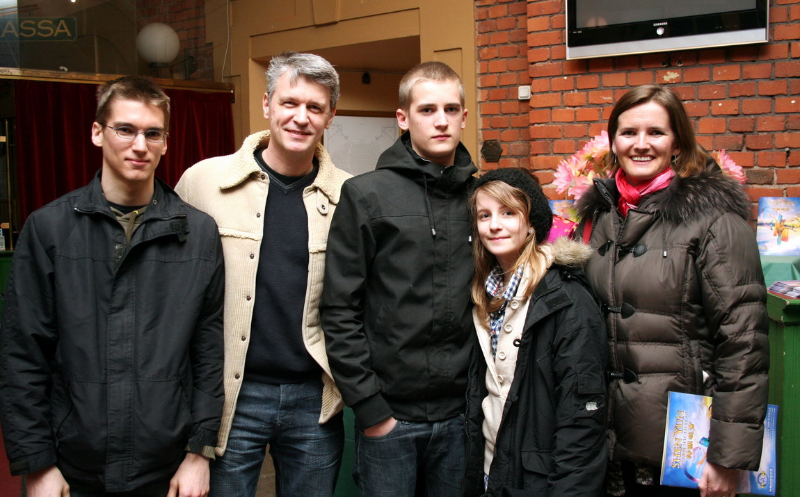 国际著名的钢琴家和音乐创作家安德斯.维克(Anders Wihk)先生(左二)与太太及小孩一同欣赏三月二十五日晚的神韵晚会。