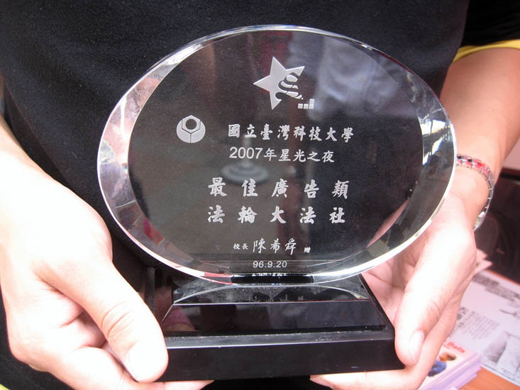 园游会中并展示法轮大法社团简介影片,这部由学员自己拍摄、剪辑制作的影片,荣获台科大在二零零七年九月举办的第一届“台科星光之夜社团联欢晚会”上之“最佳广告类奖”,此奖项是由学校各社团发挥创意,拍摄社团的宣传短片。“法轮大法社”所拍摄的影片,入围多项奖项,其中包含最佳导演、最佳摄影、最佳服装、最佳音乐、广告类五项奖项,最终获得“最佳广告类”奖项。