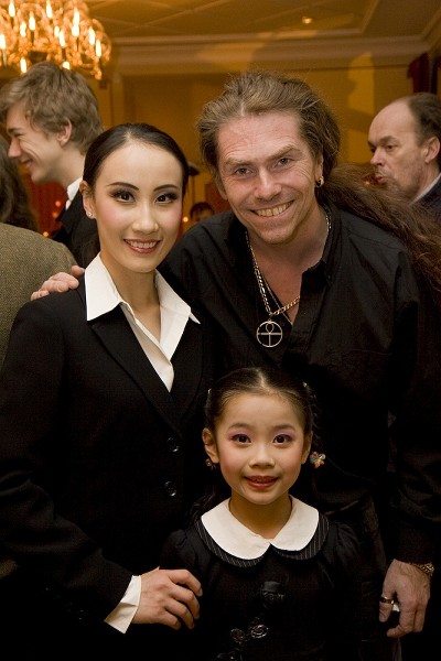 瑞典著名乐手Magnus Rosen(右)于三月二十日于斯德哥尔摩观看神韵首场演出后的茶会上与神韵艺术团七岁小演员婷婷、刘心怡合影。