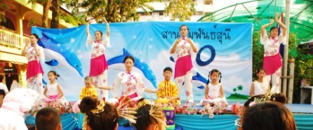 翌日,法轮功学员又出现在SUNEEPITAYA SCHOOL毕业典礼上,为全校师生作了精彩表演,教唱了「法轮大法好」歌曲。SUNEEPITAYA学校师生合唱的「法轮大法好」,给人留下了美妙而动人的一幕。