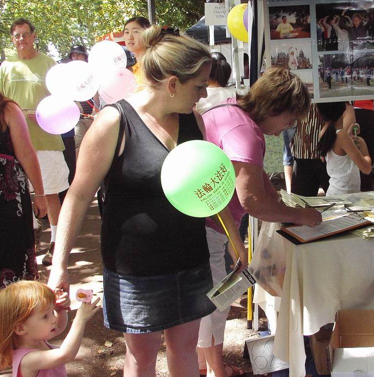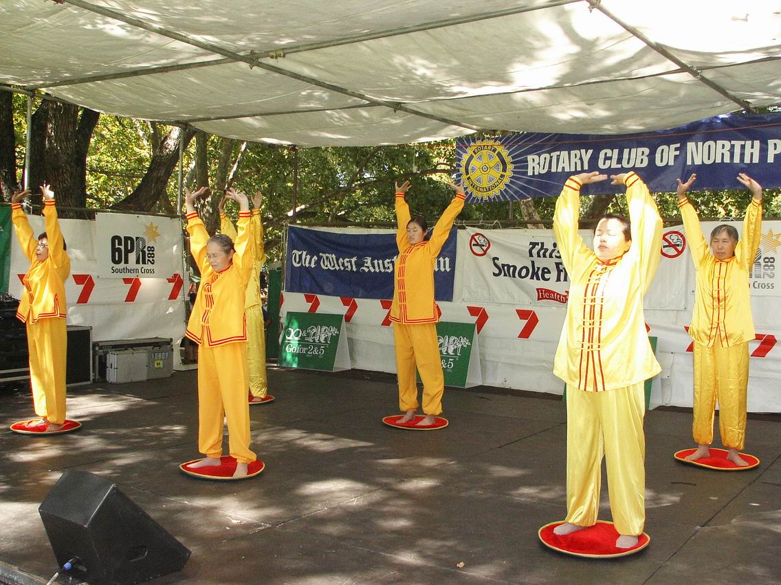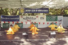 ![]() 专注于神韵演出的李彩娥女士(左一) |