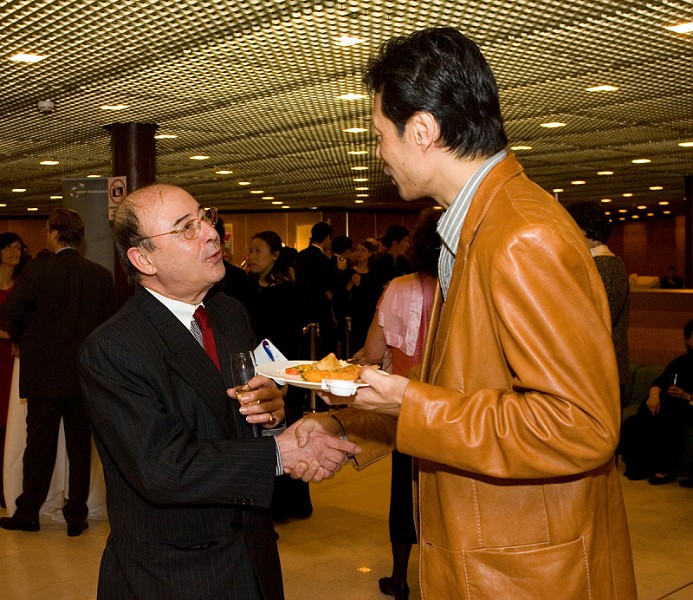 ![]() 瑞士财阀政要名流观看神韵晚会在日内瓦的首场演出后,在贵宾酒会上与神韵艺术团的艺术家和演员交谈,合影留念。 |