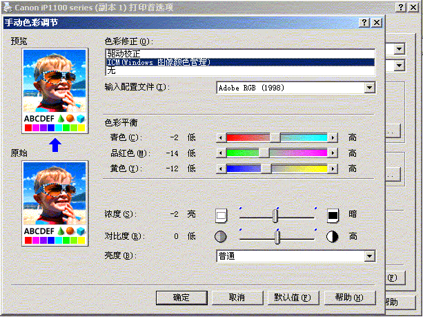 右键单击Canon iP1100 series或Canon iP1100 series (副本 1),点打印首选项,在彩色/浓度项目中点手动,点设置,在彩色校正项目中点ICM(Windows 图像彩色管理),在输入配置文件项目中,选择Adobe RGB (1998),点确定。