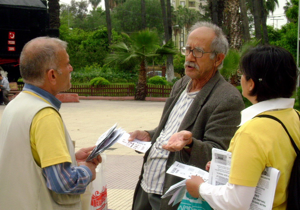 中午时分,学员们来到位于阿当那市中心最繁华的火车站广场,把一份份真相传单送到了往来的行人和上下车旅客们的手中。其间,有一位中年教师,主动走到学员们的身边询问他们在干什么。当听完学员们讲述关于中共活摘法轮功学员器官牟利并焚尸灭迹的暴行后,他非常震惊。他说,中共简直太无人性了,中共的所作所为一定会遭到天谴的。他告诉学员,他要把这些揭露中共罪行的材料张贴在学校的启示板上,让更多的教师和学生都来了解中共的残暴行径。还有一位不识字的农民,在听了学员们讲的真相后,多要了几份传单,说要带给他的家人和亲戚,让他们都知道中共的魔鬼行为。