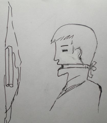 ![]() 棒子用布包上勒在嘴上“啃骨头” | ![]() 在严管队法轮功学员头被戴防撞墙帽、嘴被上“啃骨头”、手被反铐固定在地上、脚被死囚绳绑、身体在尿液中 |