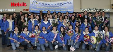 二零零八年四月二十日下午五时,纽约肯尼迪国际机场,神韵巡回艺术团从欧洲载誉归来,当地人士手捧鲜花和“欢迎归来”的彩球,举着温馨的横幅前来迎接。