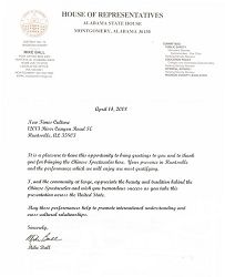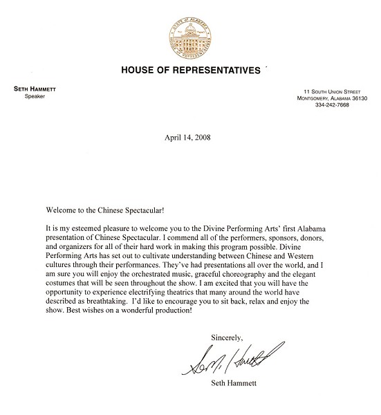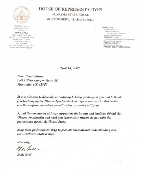 邀请演出的亨茨威尔城市(Huntsville)所属的阿拉巴马州众议院议长塞斯·哈密特(Seth Hammett)十四日来信祝贺说,神韵巡回艺术团已经在世界各地演出,亨城观众也定会欣赏其精心安排的音乐,优美的舞蹈和典雅高贵的服装。