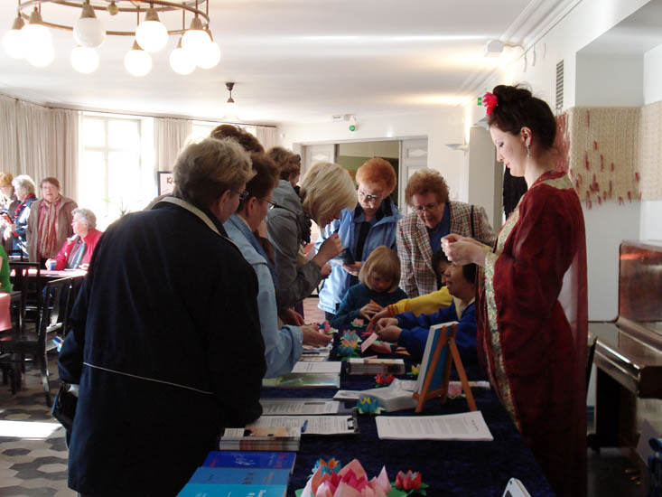 展览会刚开始不久,就有很多人被美丽的纸莲花所吸引,纷纷来到法轮功的展位前一边学习折莲花,一边了解这些纸莲花背后的故事。