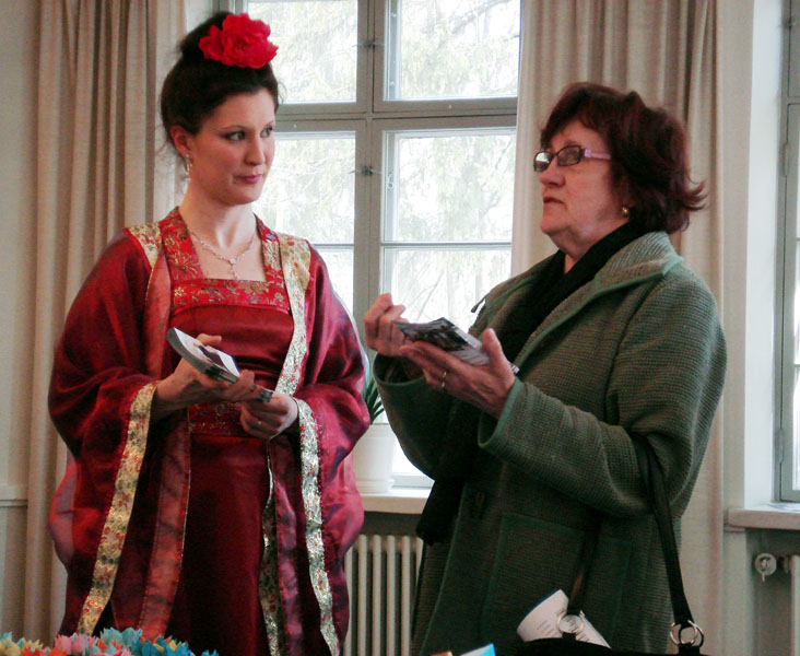【明慧网二零零八年四月二十二日】二零零八年四月十九日,应诺基亚市狮子会(Lions Club Nokia Lotus)的邀请,芬兰部份法轮功学员身着美丽的仙女服,一早就来到了毗邻芬兰第三大城市坦佩雷(Tampere)的诺基亚市(Nokia),参加了“新高贵女性展览会”(Uusi Uljas Nainen-Messut),将大法的美好与祥和带到了这个小城。