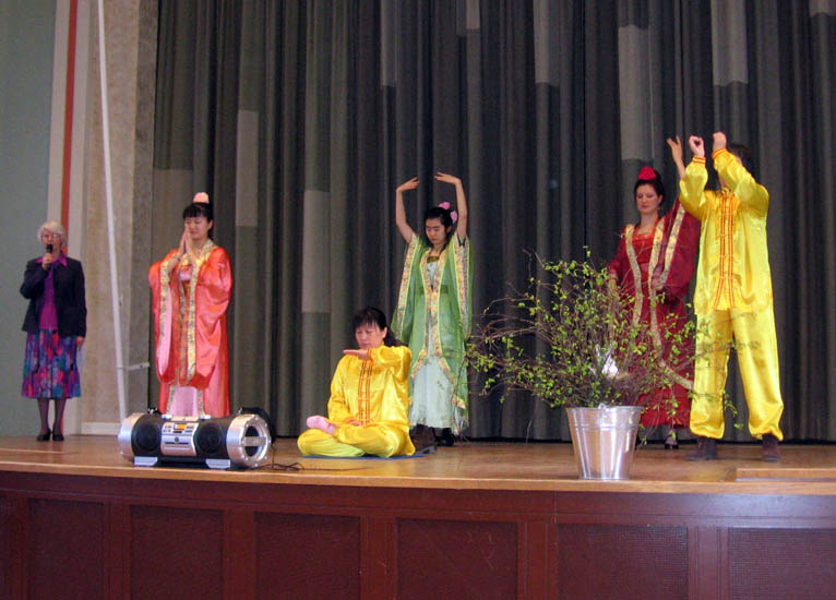 她又一一的介绍了五套功法。法轮功学员缓慢而优雅的炼功动作赢来了观众的阵阵掌声。最后,她告诉人们,这样一个教人们做好人,带给人们身心健康的好功法却在中国遭受着残酷的迫害,并讲述了迫害的真相。