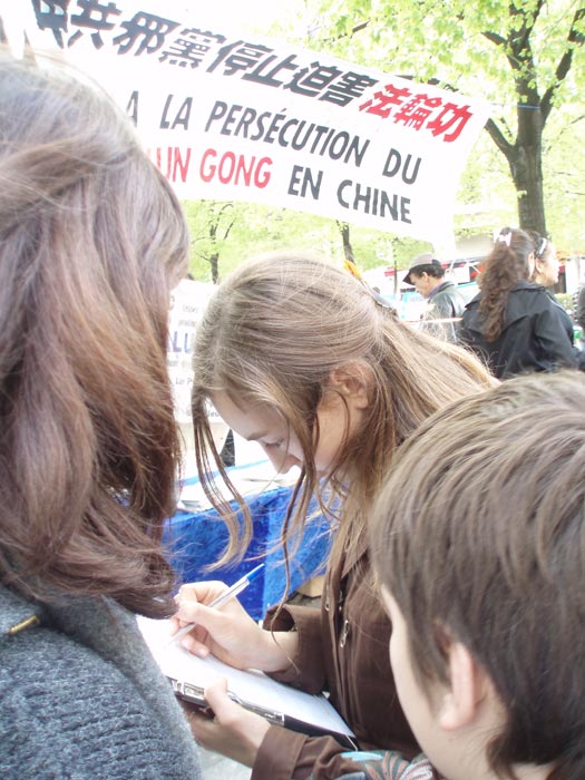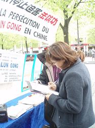 一位法国女士在签名后说:“我觉得中共迫害法轮功的行为是可耻的,是对人权的嘲讽。这一切无法令人接受,对于这里生活在民主国家的人来说感到非常的震惊。”
