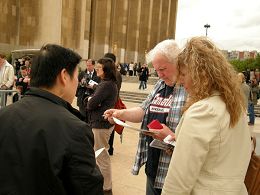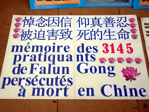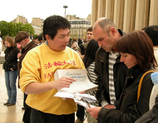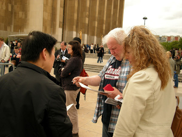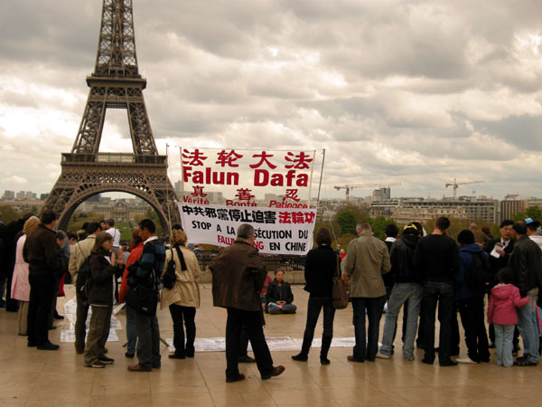 【明慧网二零零八年四月二十三日】为了终止中共对法轮功的迫害,八年多来,法国巴黎法轮功学员持续在巴黎埃菲尔铁塔对面的人权广场上,揭露中共用谎言和暴力所维系的罪恶--对法轮功学员的迫害和残酷虐杀,特别是中共灭绝人性的活体摘取器官的罪恶。巴黎法轮功学员长期以来和平反迫害的活动,让人们了解了真相,知道法轮功是“真、善、忍”,看清了中共的“假、恶、斗”。