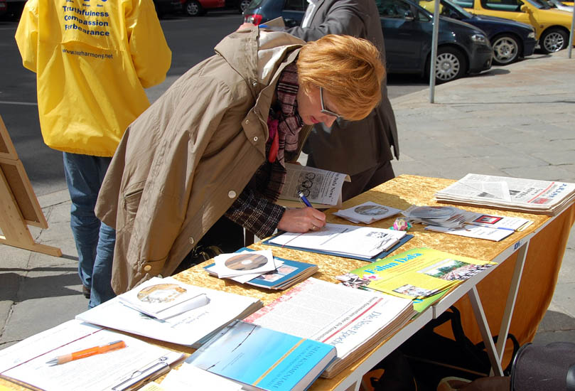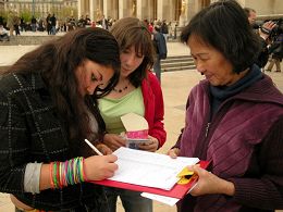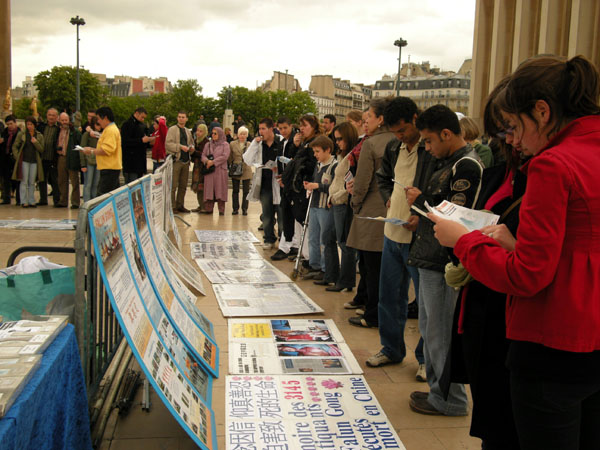 二零零八年四月二十日星期天下午的巴黎人权广场上,络绎不绝的世界各地的游客和当地民众,被法轮功学员展示的舒缓优美的功法所吸引。看到揭露中共虐杀法轮功学员的真相展板时,人们感到震惊,纷纷观看、了解、询问,并签名支持法轮功,支持由“法轮功受迫害真相联合调查团”(简称CIPFG)发起的《全球百万联合签名书》,呼吁制止迫害。