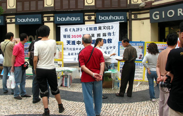 澳门是法治社会,又签署了国际人权公约,但受中共的压力,时有警察来干扰讲真相活动。法轮功学员告诉警察,“你的行为违反了澳门法律”。对方讲:“我按上级指示办事,你讲法律,我没兴趣。”也有警察讲:“澳门回归了,‘人权法’过时了。”学员对警察的违法行为深感遗憾,但不为所动,坚持讲真相。