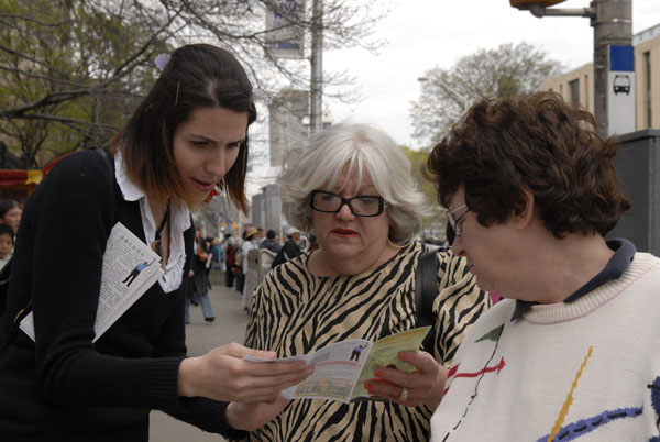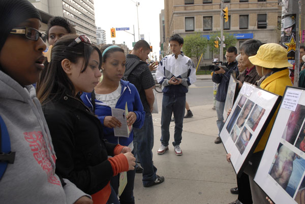法轮功学员在市中心的Bloor街,用中文、英语打出:“法轮大法好”、“法轮大法是正法”、“法轮大法使上亿人身体健康,人心向善”“停止对法轮功学员的群体灭绝”、“在中国的劳教所里发生着活体摘除法轮功学员人体器官的兽行”等横幅,引来众多行人的驻足观看。