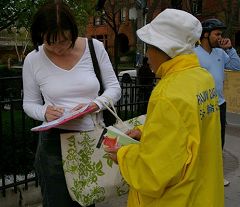 现场有不少路人在真相调查团发起的“停止迫害法轮功百万签名”上签名。
