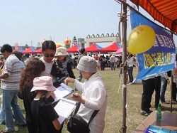 虽然会场上音乐声很大,但学员们不停的告诉现场的民众中共的邪恶真面目,请大家签名支持反迫害。善良纯朴的澎湖人纷纷签下了自己的名字,两天签名的民众约一千八百人,地方官员四十三人以上。