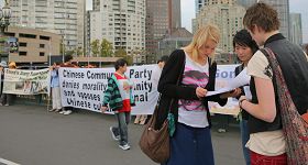 ![]() 过往民众主动与学员交谈了解法轮功真相 |