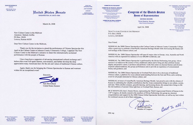 堪萨斯的Overland Park市市长Carl Gerlach也发出贺信,表达欢迎之意,并期待神韵所带来的音乐舞蹈的表演,以及生动的服饰与舞台,使观众享受一场真正的中国文化表演。