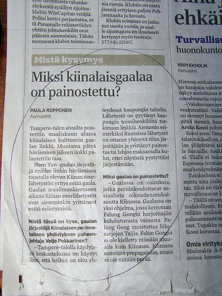 Aamulehti是坦佩雷市的主要报纸之一,该报记者PAULA ROPPONEN在三月二十九日发表了题为《为什么神韵晚会受到了压迫?》的文章,文中说: