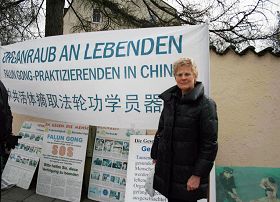 体育教师霖摩尔(Susi E. Limmer)告诉记者,她家就在附近,几年来经常看到法轮功学员在中领馆前抗议,她认为中共活体摘取器官太恐怖,不能听之任之。她也提到从慕尼黑的报纸上得知了中共干扰神韵演出的事,最后她签名制止中共的恶行。她看到自己的邻居正和法轮功学员交谈,马上把签名表塞到邻居手中,让他们也签名。