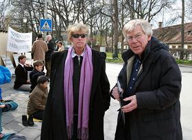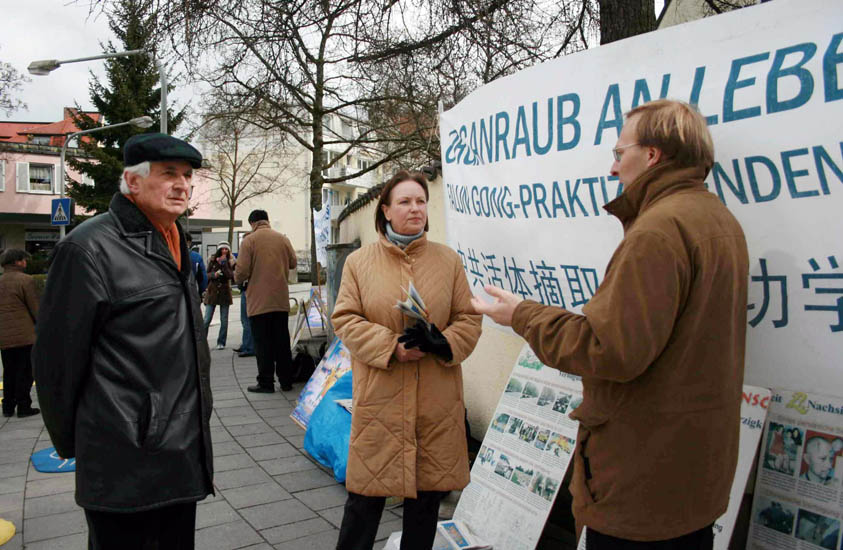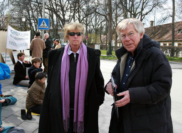 博恩霍夫尔夫人(Gabriele Bonhoeffer)退休前是新闻界人士,他们夫妇看到关于中共活摘法轮功学员器官的横幅后,停下了脚步,经过与法轮功学员的交谈,他们十分爽快的签了名,并祝法轮功学员好运。