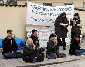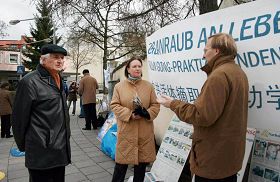 【明慧网二零零八年四月七日】(明慧记者德祥慕尼黑报道)二零零八年四月六日,清明节刚过,法轮功学员来到德国慕尼黑中领馆对面举行抗议活动。他们打出了“中共活体摘取法轮功学员器官”、“中共必须停止干扰神韵”等横幅,揭露中共对法轮功学员实行令人发指的器官活摘暴行,以及前不久发生的中领馆干扰神韵演出的事件。横幅吸引了附近居民和外出春游的人们的注意力,不少人停下来询问,也有不少人表示已经了解了这些情况,并主动签名制止中共继续行恶。