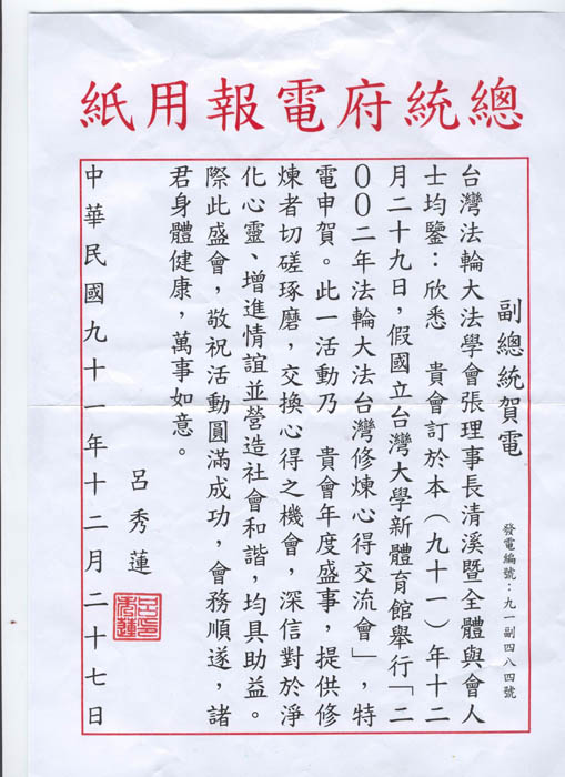 二零零二年五月十二日,全世界共庆法轮大法洪传十周年及五月十三日世界法轮大法日的前夕,花莲县议会议长杨文值代表全体县民呼吁中华人民共和国政府立即停止对法轮功学员非正义和非人道的迫害,并预祝全世界千千万万善良的人们永远根植在真善忍的高境界领域中。