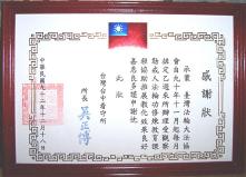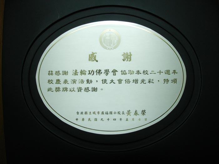 二零零三年十二月,台湾法轮大法学会陆续接获国防部中部地方军事法院检察署看守所与台中看守所颁发的感谢状。感谢状上写着“功德无量”四个字以表彰法轮功学员自二零零一年起,每周义务的前往看守所弘扬法轮功,协助推展教化,使受观察勒戒人在身心方面都有显著提升。