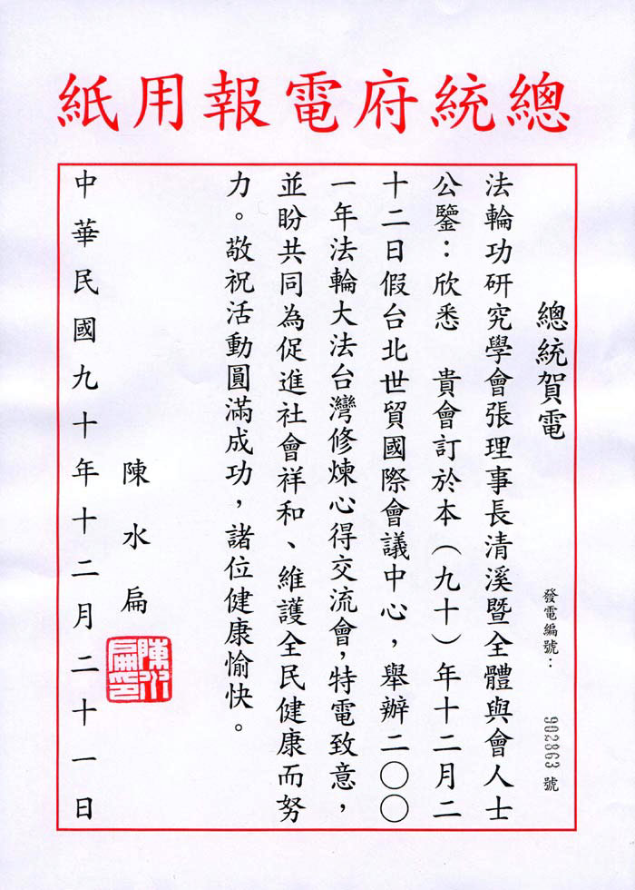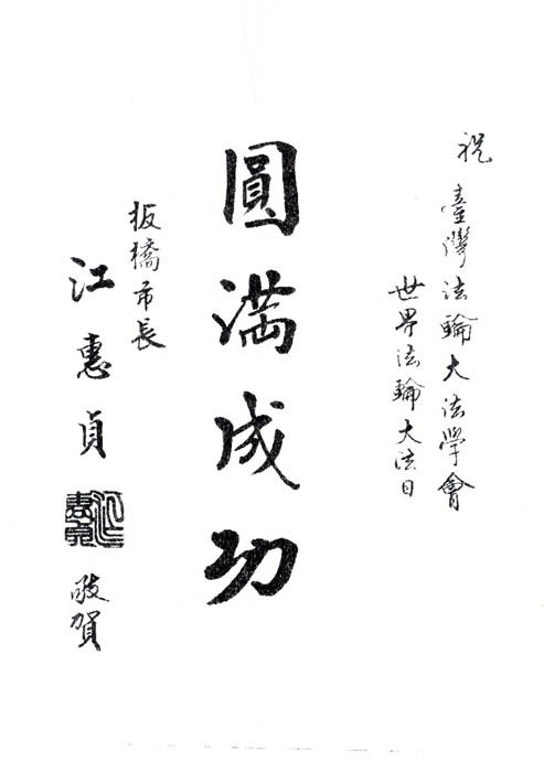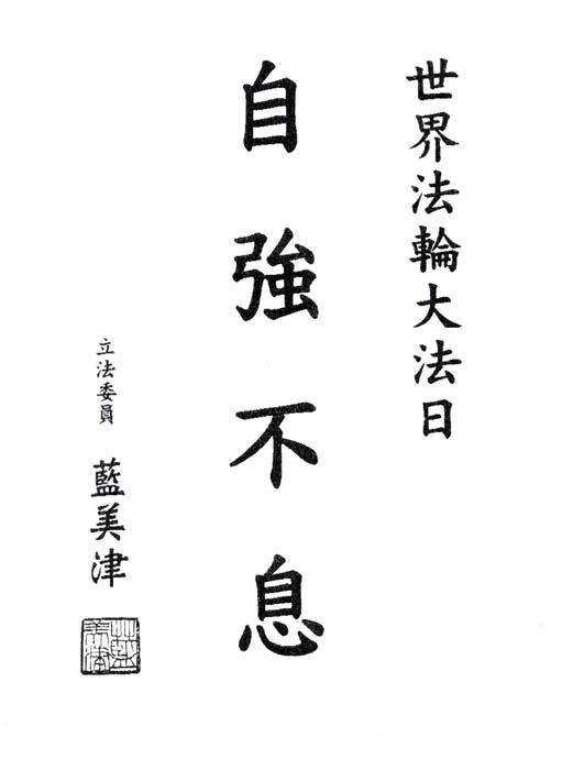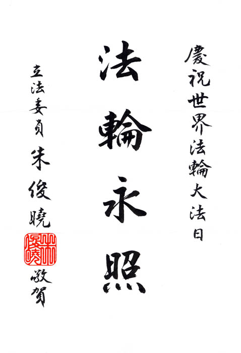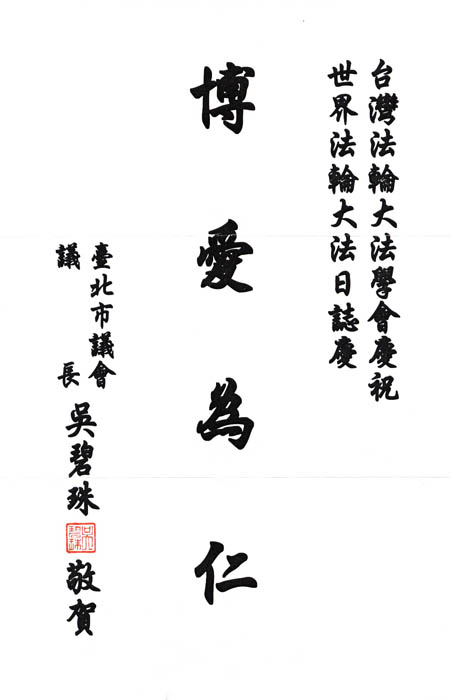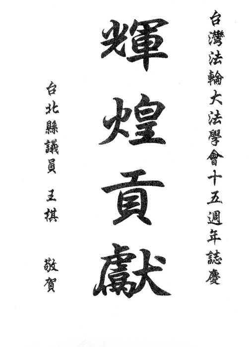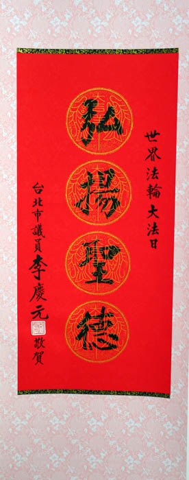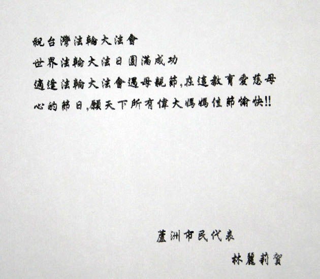 二零零七年五月十三日「世界法轮大法日」前夕,主办单位获得台北市议会议长吴碧珠、板桥市长江惠贞、台北市议员李庆元、颜圣冠、台北县议员李倩萍、王棋、立法委员蓝美津、朱俊晓、蔡同荣及芦州市民代表等多人的贺辞、珍文与墨宝等。