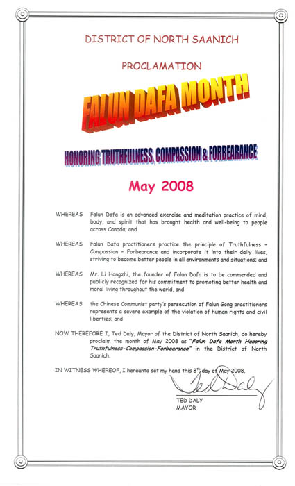 因此,我,泰•达利(Ted Daly),萨尼奇北部地区市长,在此宣布二零零八年五月为萨尼奇北部地区“法轮大法真、善、忍月”