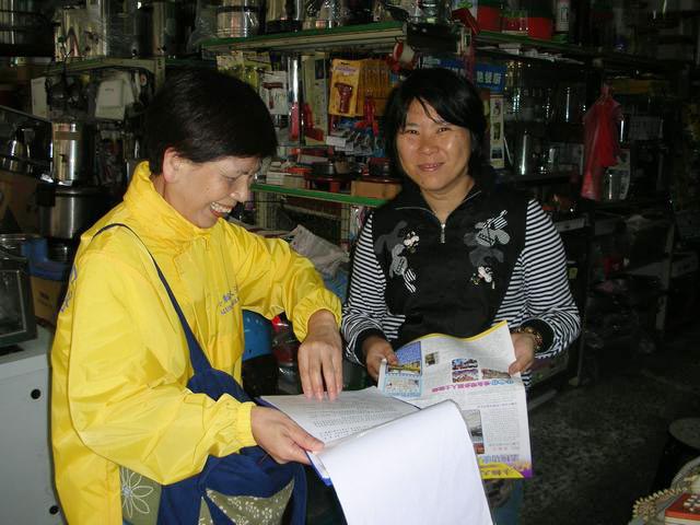 边帮客人刮胡子边听真相的理容院的老板娘、槟榔摊里原本不耐烦的年轻人、还有诊所中刚看完病的患者等等,在经过学员讲真相后,不但签下了他们的名字,更令人可喜的是,透过学员祛病健身的亲身经历,引起他们对于学炼法轮功的兴趣,也许有一天,他们也将透过学炼法轮功,亲身向世人见证“法轮大法好!”