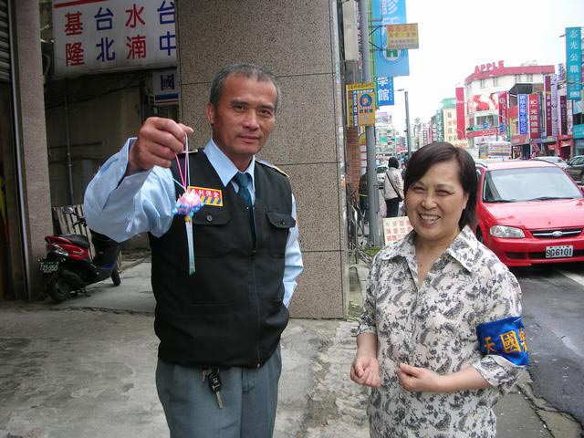 正在执行大楼保全工作的阮先生,在法轮功游行队伍经过时,好奇的站在大楼门口观看,这时经过的法轮功学员赠他两张莲花书签,他高兴的合不拢嘴。他静静的听法轮功学员讲真相,不时点点头表示认同。最后,学员告诉他可以在住家附近的公园找到法轮功的炼功点去学炼,阮先生很开心的拿起莲花书签照相并点点头。
