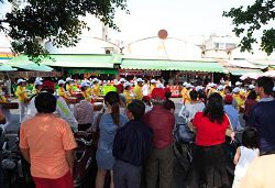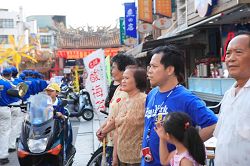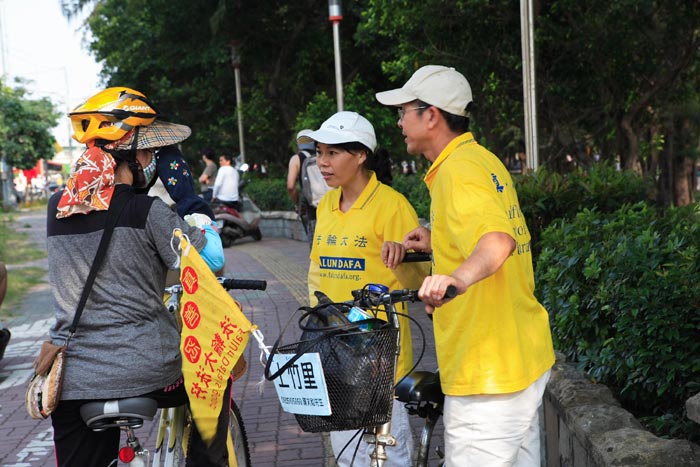 另一组是约一百五十位学员两人一起骑协力车带着真相资料和洪法莲花,踏遍旗津所有邻里,发资料讲真相,民众接到莲花和资料都好高兴连说谢谢,不少人询问炼功点情形想学炼法轮功,更有人知道学员们在庆祝世界法轮大法日,也开心的大声说:祝法轮大法师父生日快乐!