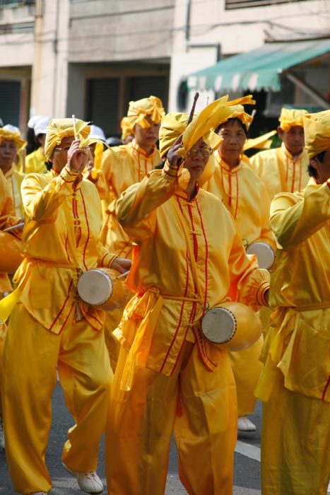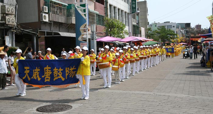 游行队伍从旗津渡船场出发,途经旗津闹区,最后抵达旗津区公所水舞广场。队伍由手持“法轮大法好”横幅的天国乐团引领,接着仙女队、乾坤鼓队、天威唐鼓队、最后由腰鼓队压轴组成,向世人展现着大法的美好。天国乐团响彻云霄的乐音,沿途吸引人潮夹道围观,很多路人鼓掌说“法轮大法好”,有的人还主动向“仙女”索取莲花和真相材料。