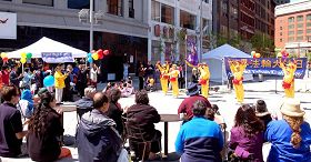 在这普天同庆的节日,为了让可贵的中国人能了解大法的真相,波士顿学员特意在华埠举行庆典。加以正逢母亲节,又靠近华埠牌坊入口处,来往行人驻足观赏,异常热闹。