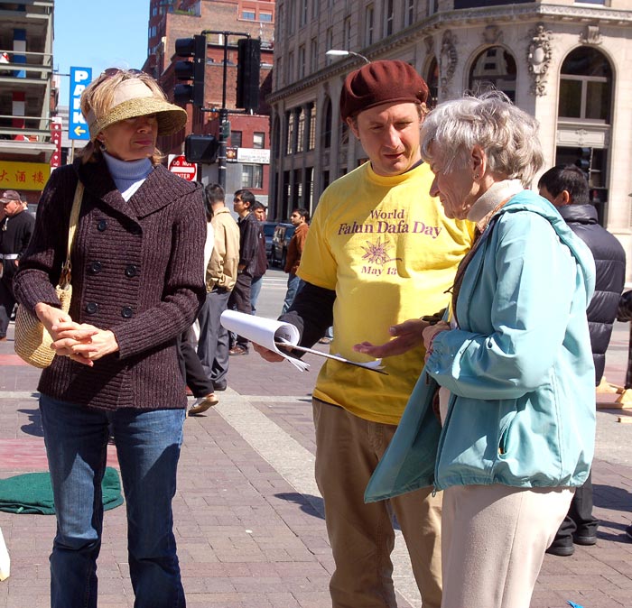 一对远由亚洲来的夫妻,到波士顿华埠观光时,把握机缘,学习了法轮功功法。