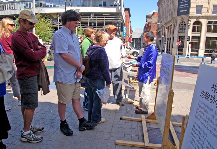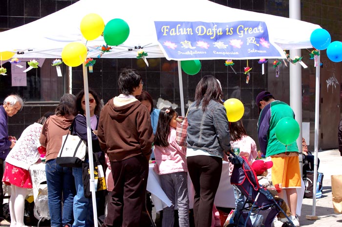 ![]() 法轮功摊位前来了解真相的人群。 |