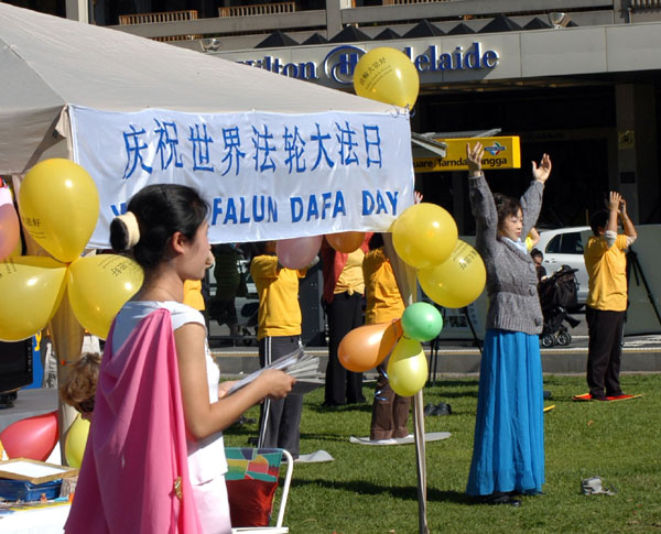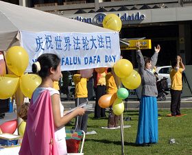 【明慧网二零零八年五月十三日】澳洲南澳地区法轮功学员于五月十日在市中心维多利亚广场举办文艺演出、功法示范及法轮功真相图片展,庆祝二零零八年世界法轮大法日。
