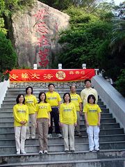 二零零八年五月十一日世界法轮大法日前夕,部份金门大法弟子相约登山,在金门第一高峰太武山的「毋忘在莒」石碑前留影,恭祝慈悲伟大的师尊生日快乐,互勉「毋忘」正法时期大法弟子的使命。