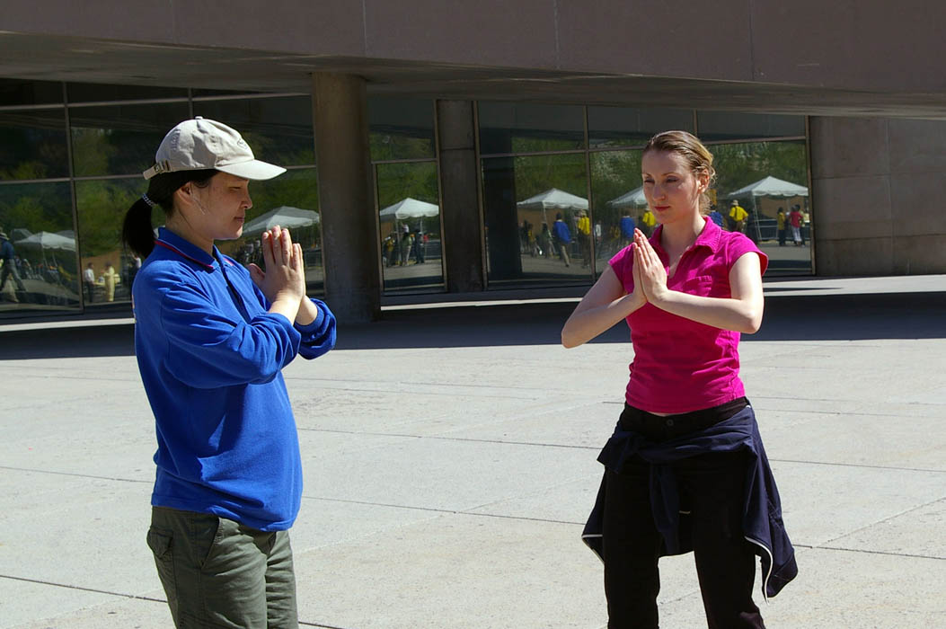 ![]() 达雅(Dharia)(右)在飞利浦广场学炼法轮功功法 |