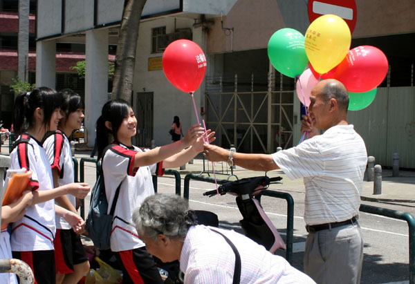 澳门法轮功学员派发写有“法轮大法好”和“世界需要真善忍” 字样的气球,庆祝世界法轮大法日。