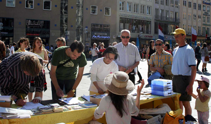 玛琳广场位于慕尼黑闹市区,风和日丽的五月,玛琳广场人山人海,不少人被法轮功优美的音乐和动作所吸引,他们认真观看展现法轮大法洪传世界、中共恶党迫害法轮功等真相图片展。很多人了解真相之后,纷纷签名支持制止迫害。广场上还有很多中国大陆来的游人,他们中有的人拍照留影、有的人接过法轮功真相资料和九评,还有的人当场表示退出中共的组织。