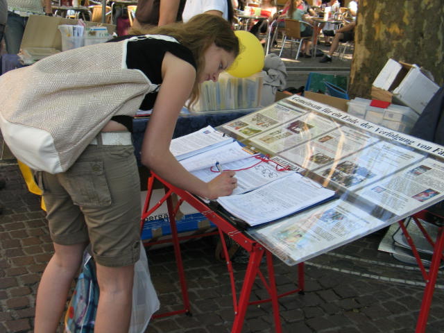 活动从上午十时开始至下午五时结束。当天阳光明媚,出来逛街的人特别多,凡路经展台的市民基本都接到了介绍法轮大法的相关资料。当他们知道了在中国大陆法轮功学员正在遭受着残酷迫害时,都极为震惊,要求在呼吁制止中共迫害法轮功的征签簿上签名。
