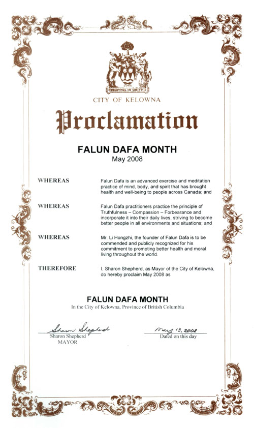 • 加拿大不列颠哥伦比亚省卡罗纳市褒奖“法轮大法月”