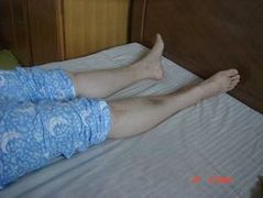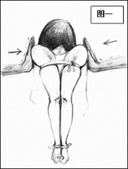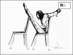 他们又将我的两个肩膀用力向后拉,并用布条将两个胳膊紧紧绑住,当时我立刻觉得两个胳膊钻心的疼痛,汗立即顺脸淌下来;他们又拿了一个高靠背铁椅子放到我的前面,将我戴了脚铐的脚放到铁椅子靠背上,这时我的整个身体呈现V形状态(图二)。一切准备就绪后他们开始对我上刑。